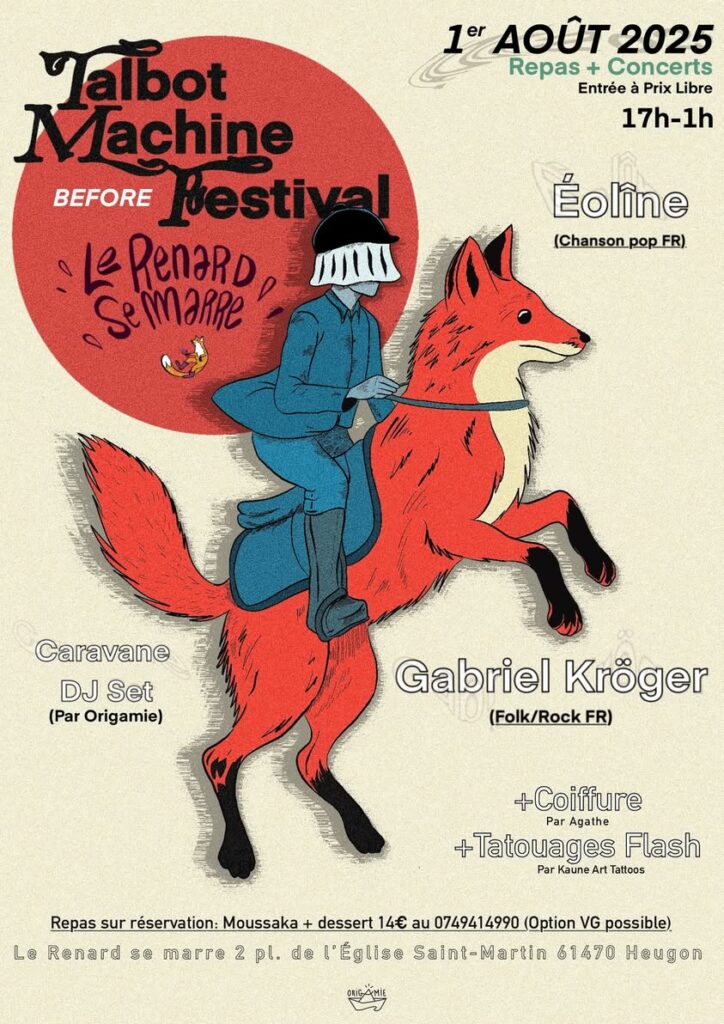 Rdv le Vendredi 1er Août au Renard se Marre pour le premier before du Talbot Machine Festival ! Au programme Concerts + Dj set + Repas + Fash Tattoos + Coiffure !